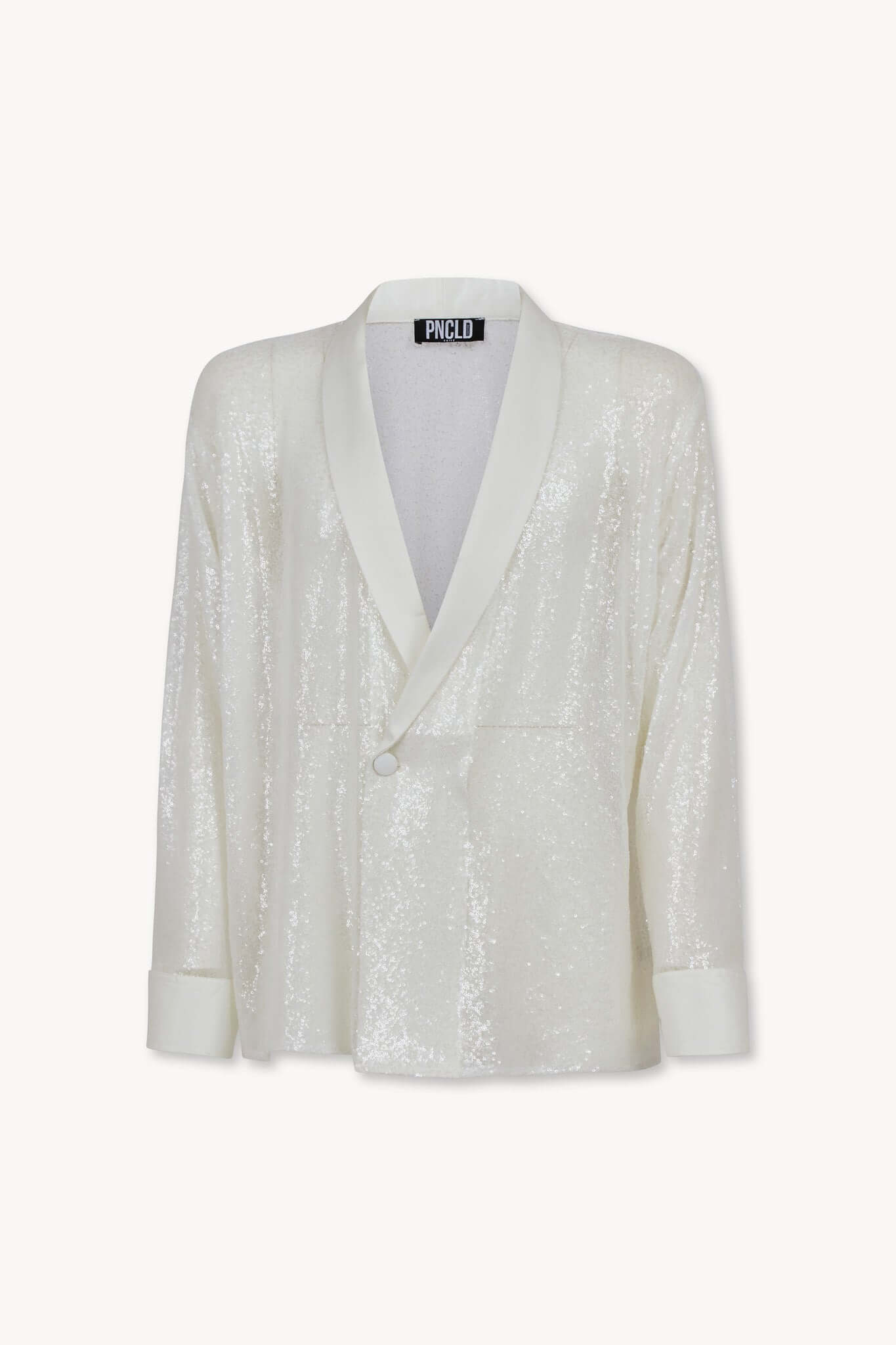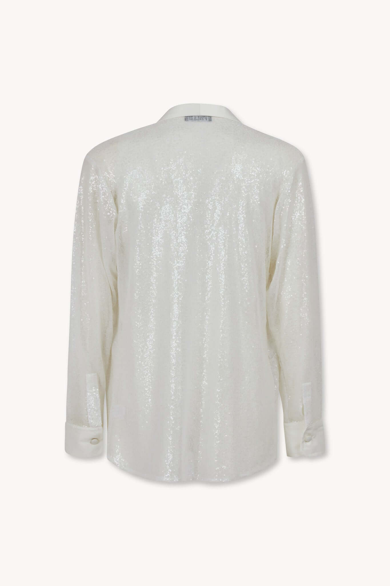 Descrizione: Camicia in tessuto paillettes bianco, dettaglio polso e collo in tessuto raso bianco, abbottonatura a scomparsa