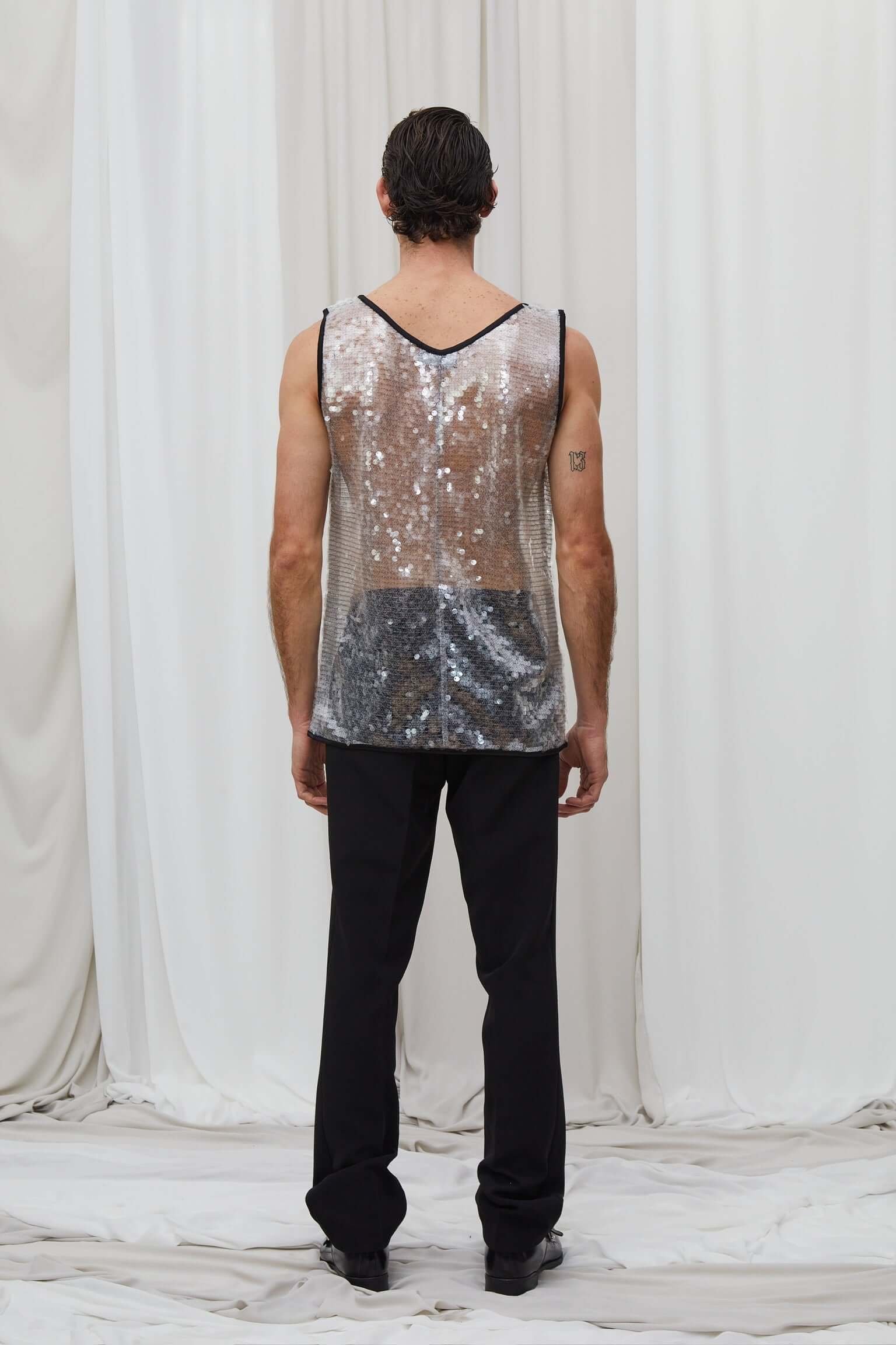 La nostra Canotta Paillettes Silver è un capo esclusivo ideato per le occasioni speciali. La sua tessitura di paillettes silver trasparente dà un tocco di lussuoso stile al tuo look. La vestibilità over completa la silhouette con una targhetta logo oro light che aggiunge una nota di raffinatezza. La Canotta Silver regala un look sofisticato e glamour.