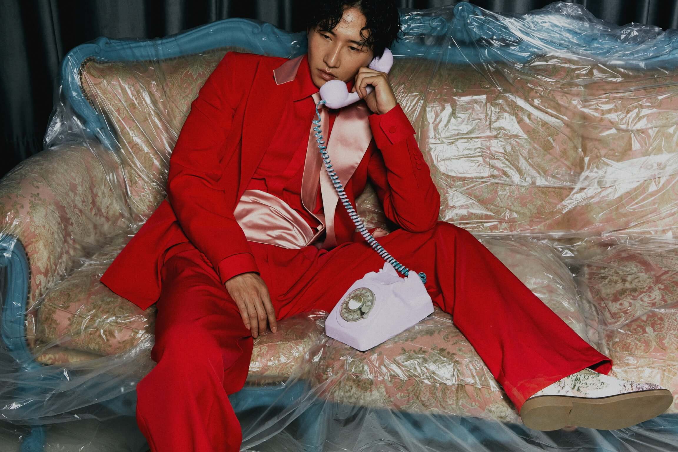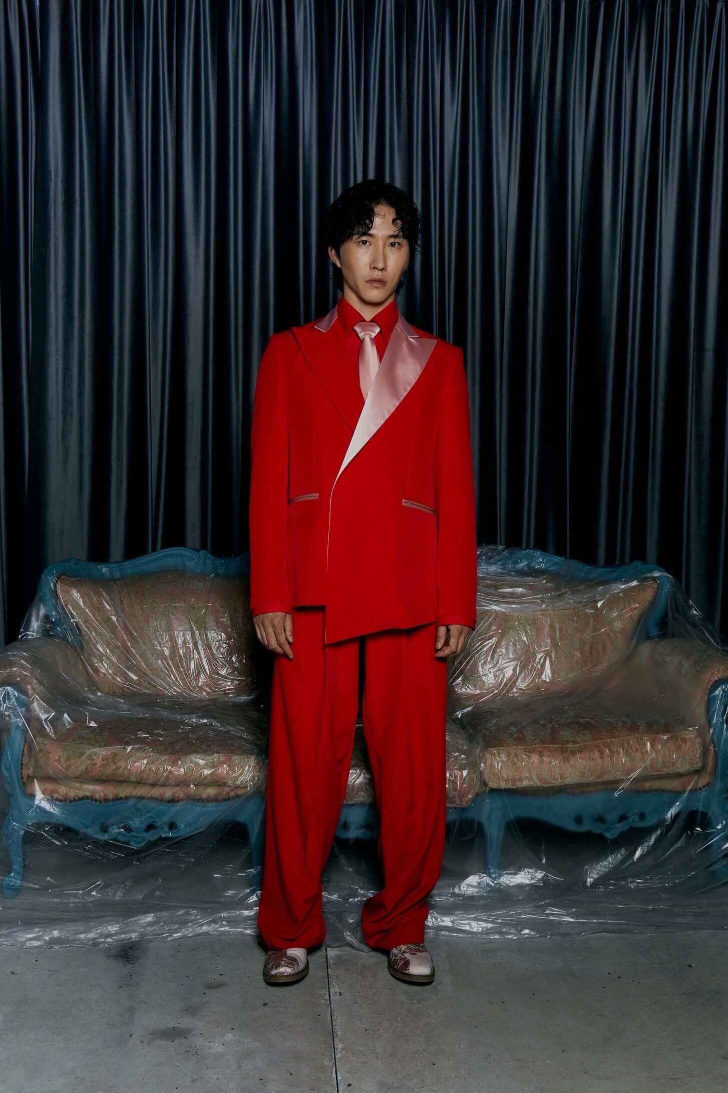 Descrizione: Giacca modello asimmetrico in tessuto tecnico bicolore rosso con dettagli collo e meta rever in rosa, abbottonatura doppiopetto un bottone