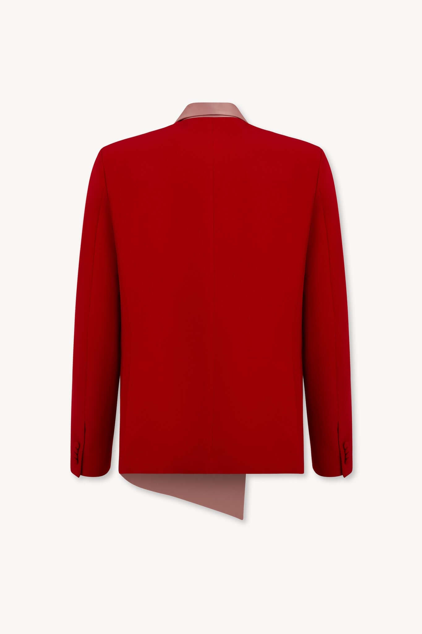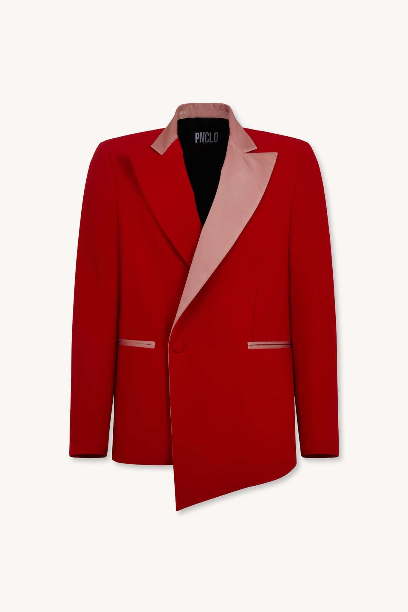 Descrizione: Giacca modello asimmetrico in tessuto tecnico bicolore rosso con dettagli collo e meta rever in rosa, abbottonatura doppiopetto un bottone