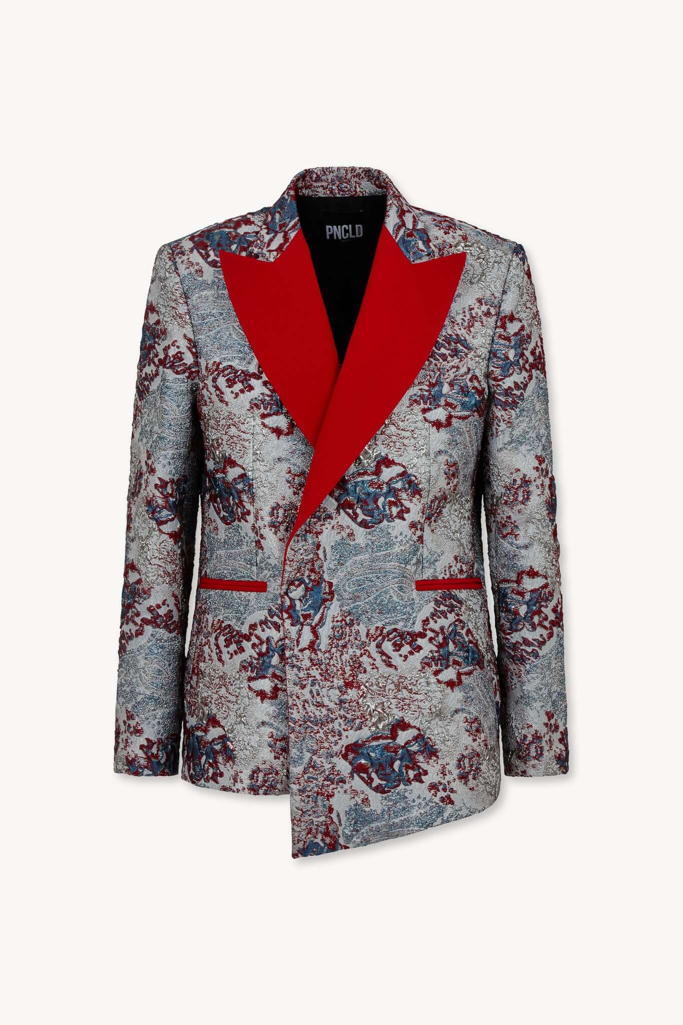 Descrizione: Giacca rever a lancia in tessuto barocco con Rever in tessuto tecnico rosso abbottonatura doppiopetto a un bottone,