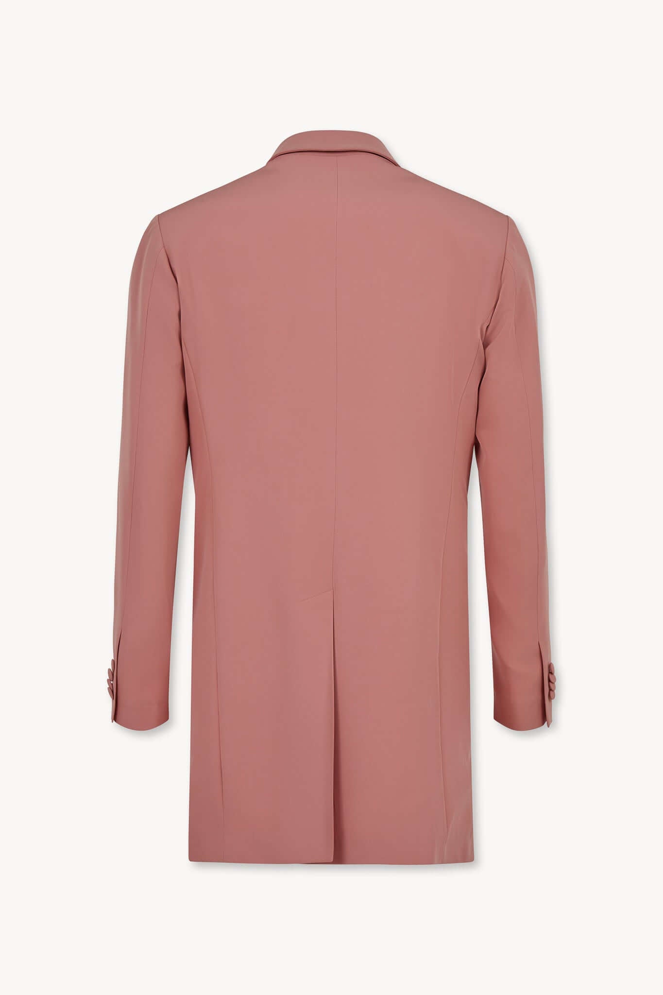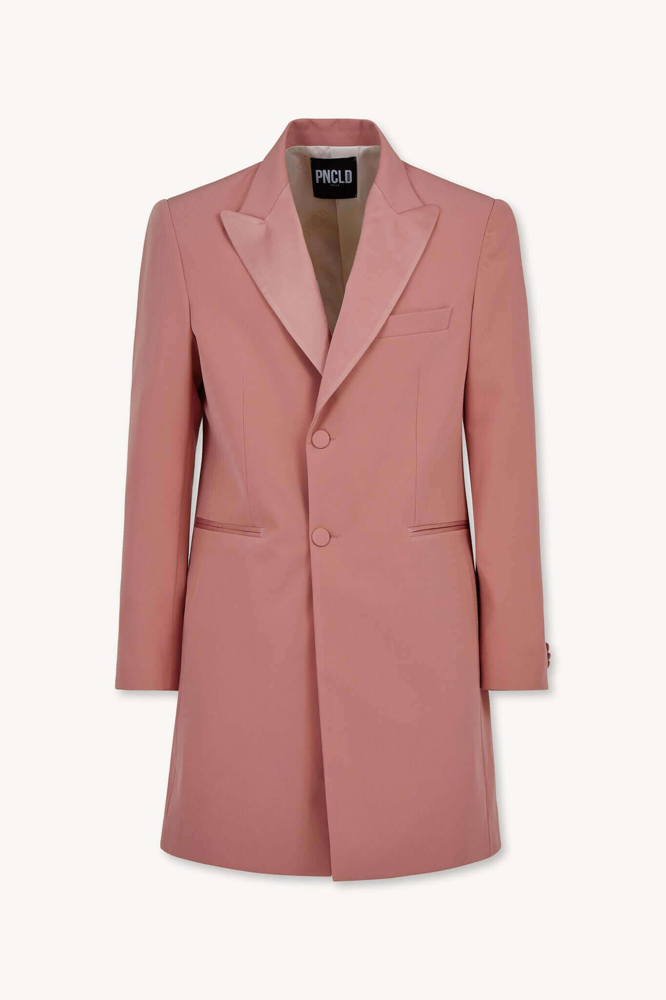 Descrizione: Giacca lunga modello rever a lancia in tessuto tecnico rosa con dettaglio rever in tessuto raso rosa, abbottonatura a due bottoni