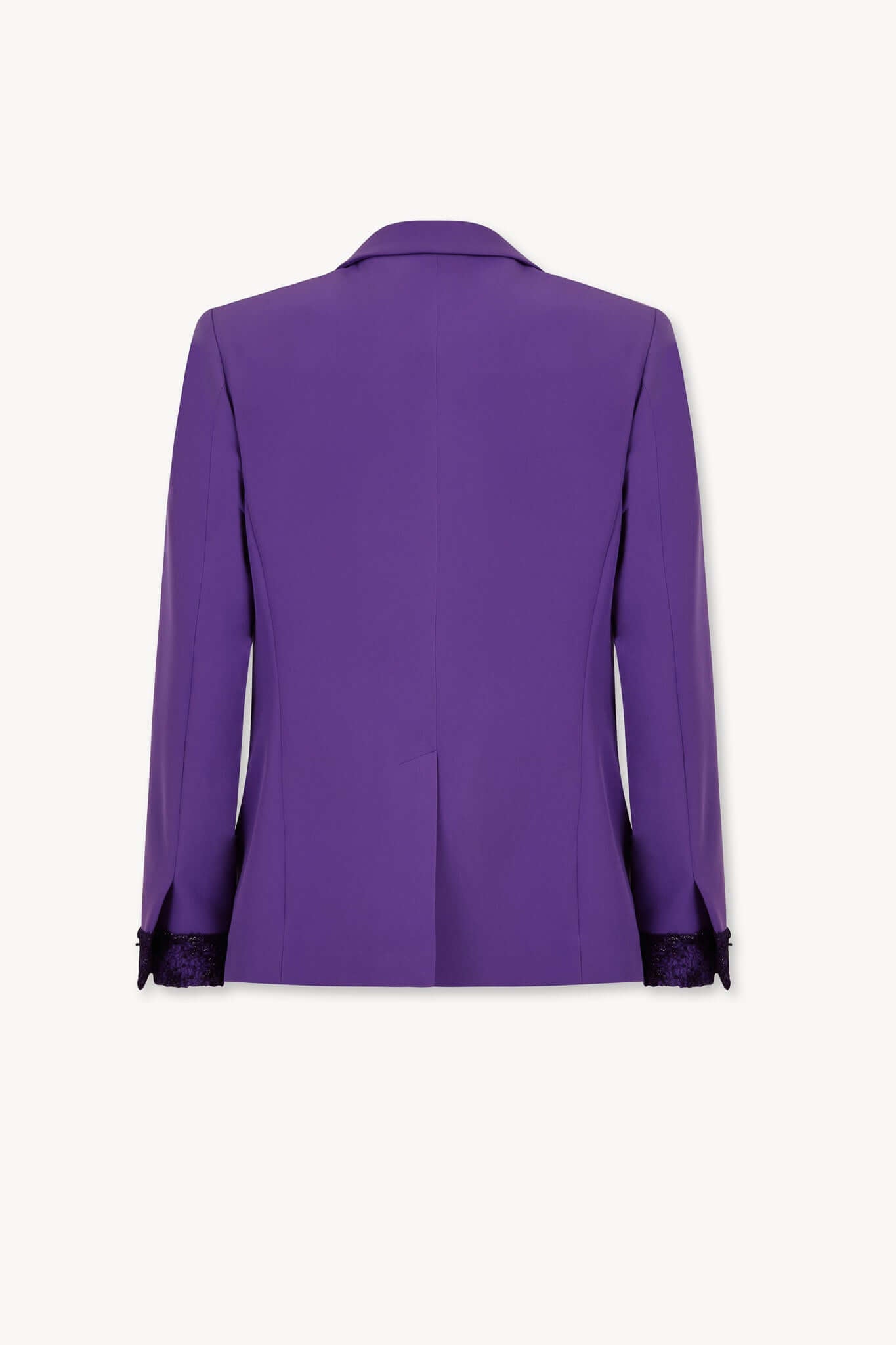 Descrizione: Giacca monopetto con rever e polso in ricamo tono su tono, con spacco centrale