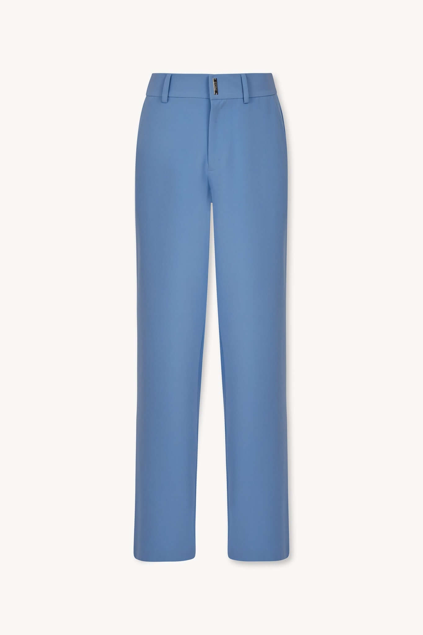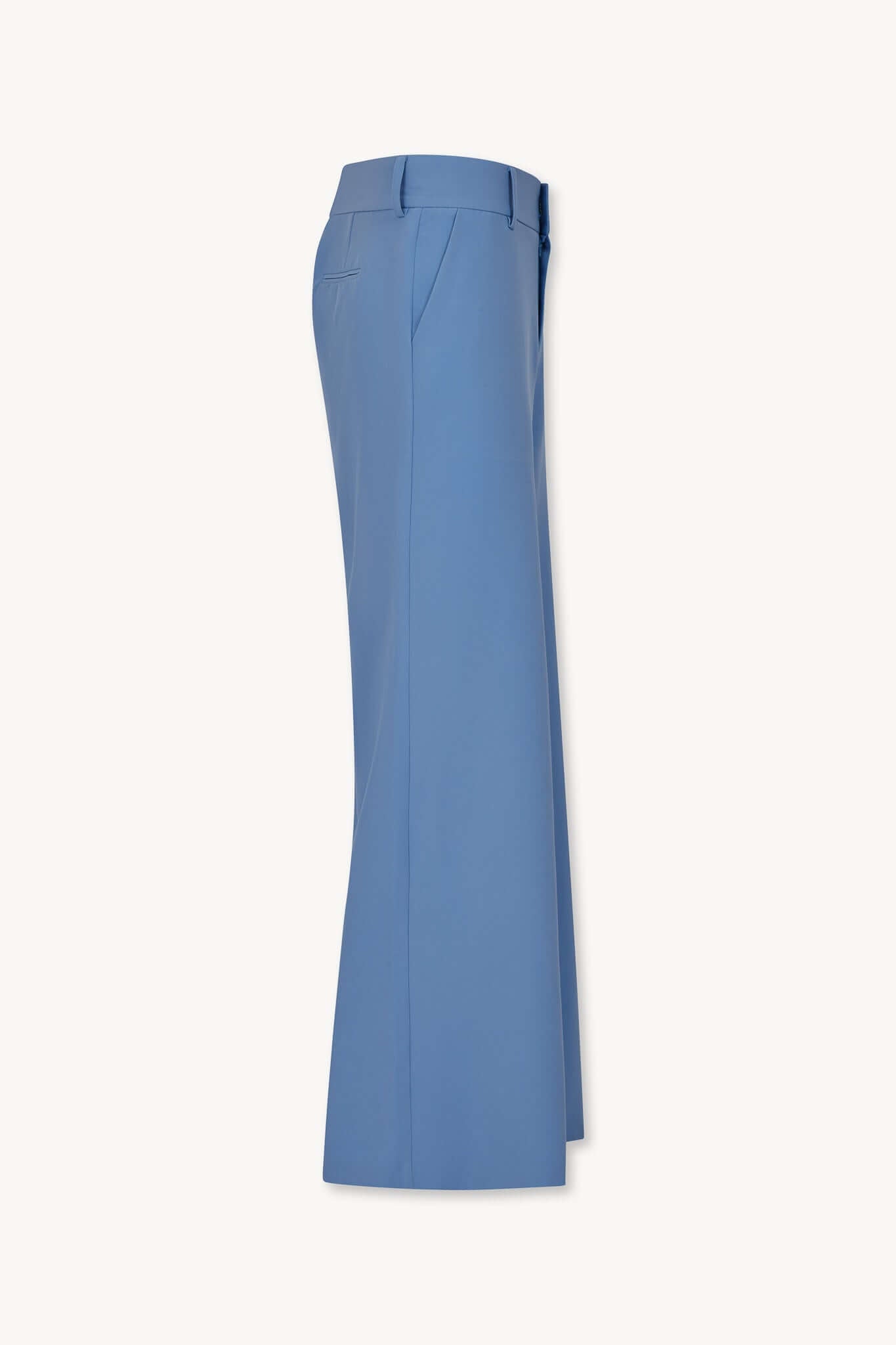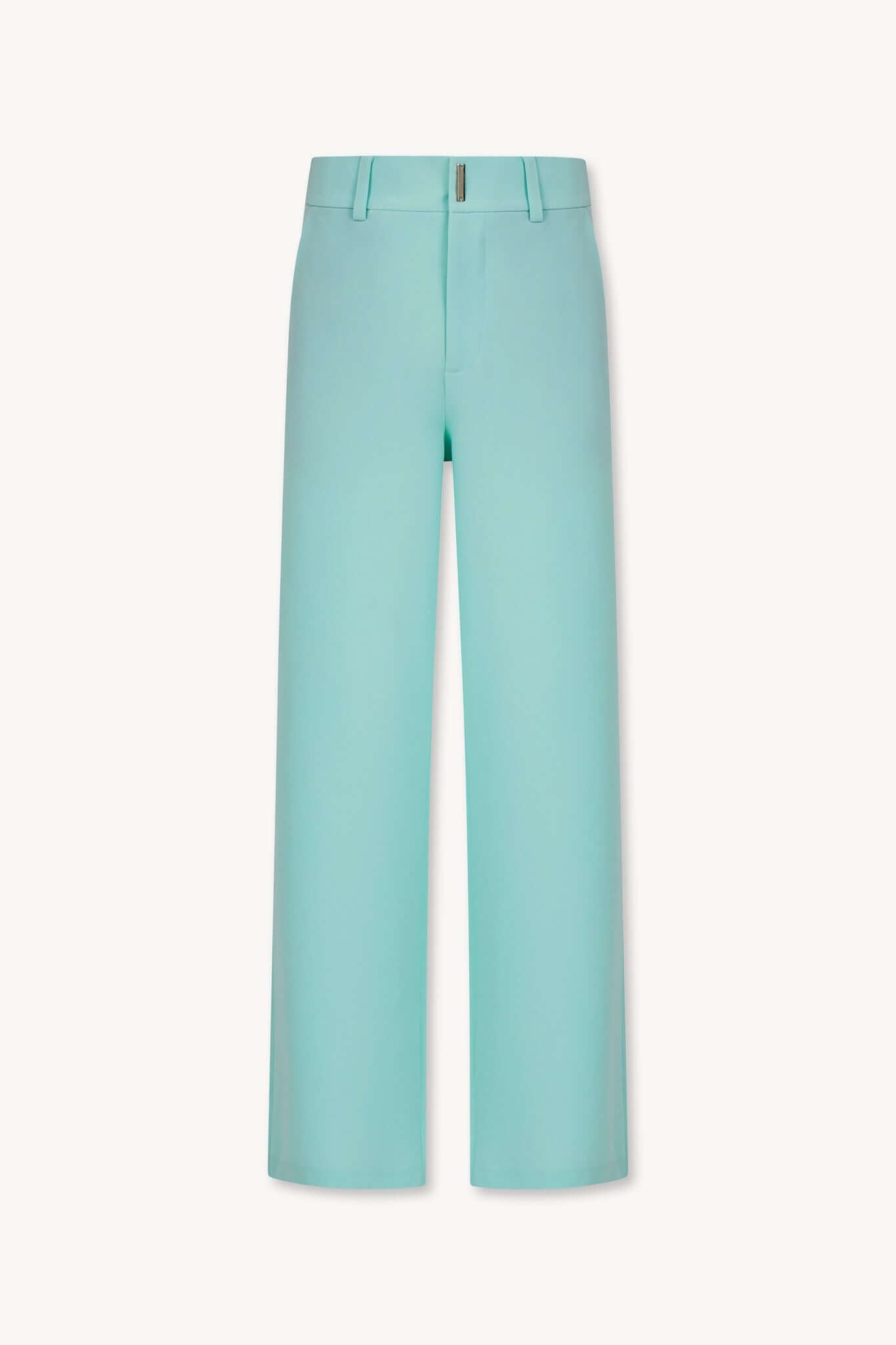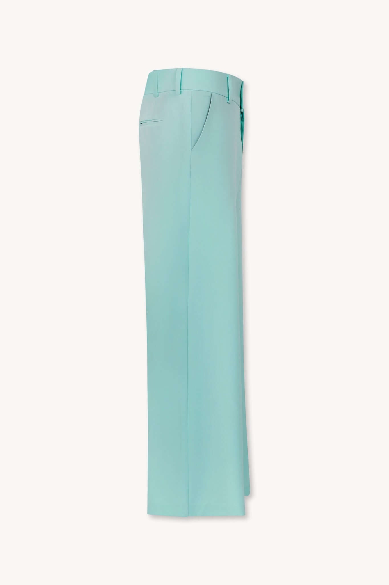 Descrizione: Pantalone in tessuto tecnico con bustino e abbottonatura con gancio, tasche laterali, fondo a palazzo
